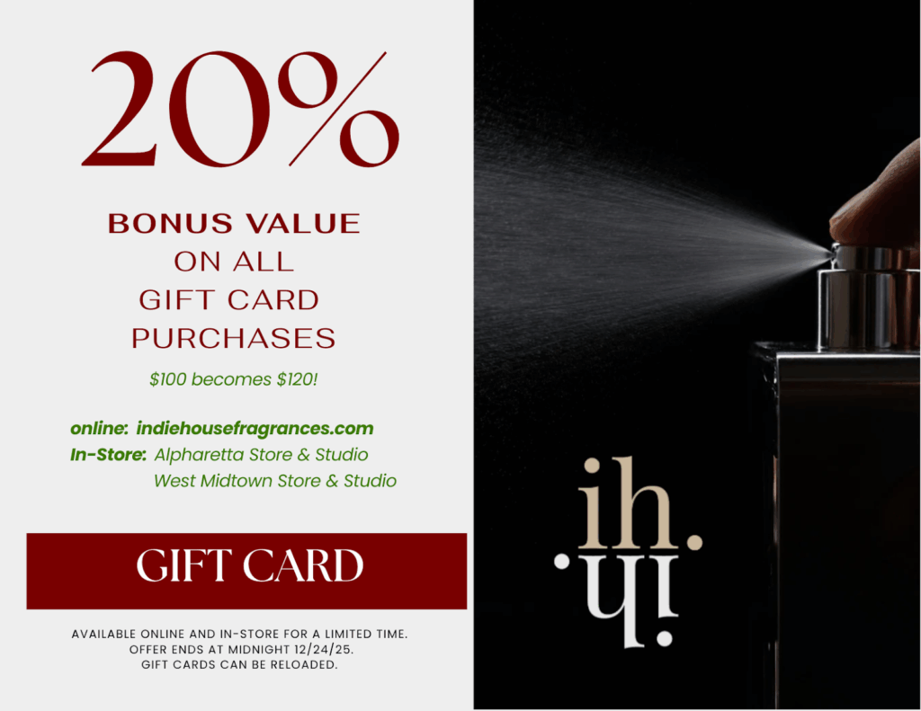 For a limited time, enjoy 20% bonus value on every INDIEHOUSE Gift Card purchased during our Holiday Gift Edit. Your gift card may be used toward fine fragrances, bespoke blending experiences, workshops, and exclusive niche collections. It’s the perfect way to share the world of INDIEHOUSE—or treat yourself.