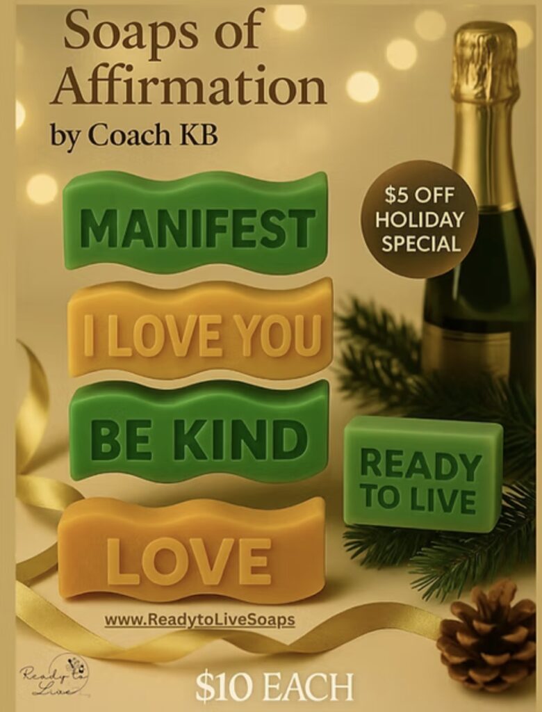 Transform your self-care this holiday with Coach KB’s Soaps of Affirmation, handcrafted bars that merge aromatherapy, color therapy, and positive intention. Each bar speaks life: MANIFEST, LOVE, BE KIND, and I LOVE YOU. A daily mindset reset in the shower. Normally $15, now $10 for the season.
